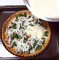 キッシュのアパレイユ(卵のフィリング)は卵2個をコシが切れてさらさらになるまで溶いて(泡立てない)、生クリーム150cc、牛乳50ccを加えてよく混ぜます。丁寧に作るならここでザルなどで漉しておくとよいです。