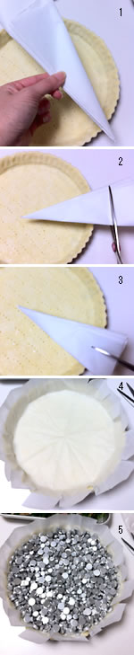 重石が生地にくっつかないよう、オーブンペーパーをぴったり敷きます。