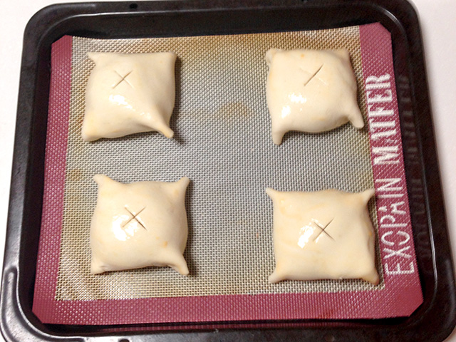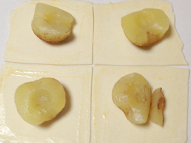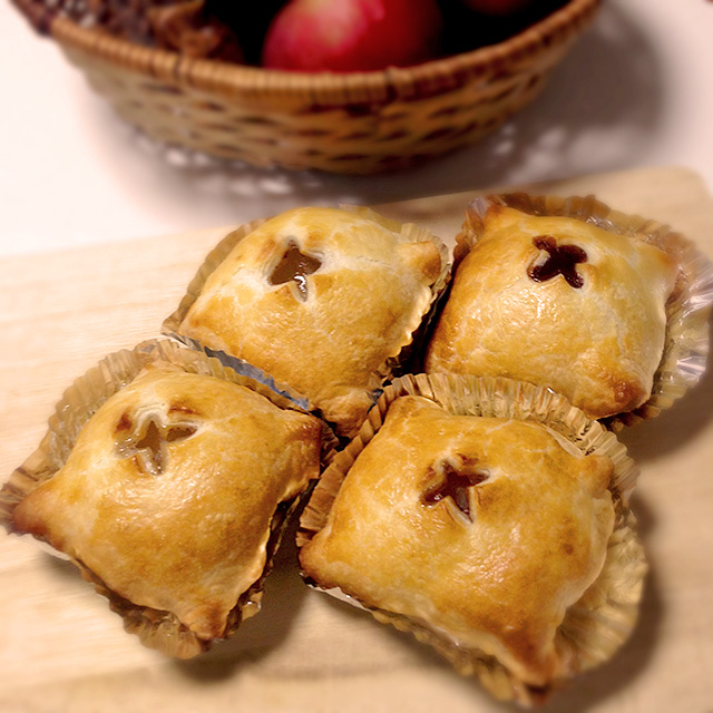 リンゴができたら、翌日パイ生地で包んで焼きます。