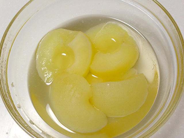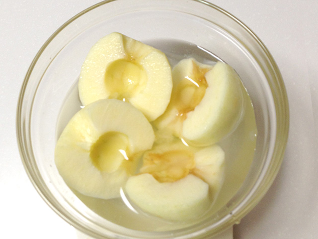 - レンジで6~8分加熱します。このとき、加熱しすぎないで。紅玉だったら5分でもいいかも。白いところが残っていてもいいのです。加熱が終わって粗熱が取れるまで放置するとシロップを吸って黄色くなります。