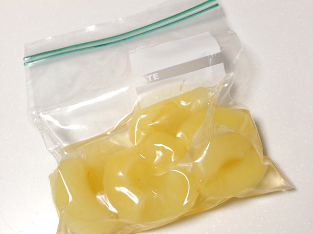 - さらにシロップを吸わせるために3時間~一晩冷蔵庫で寝かせます。そのとき、シロップにちゃんと浸るようにジップロックに入れて空気を抜いとくとさらにgoodです。