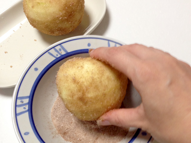 - リンゴにシナモンシュガーをまぶし、中央の穴にバター小さじ1くらい(適当)と残ったシナモンシュガーを詰め詰め。