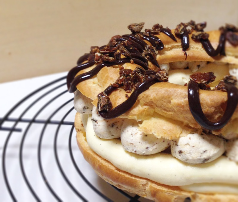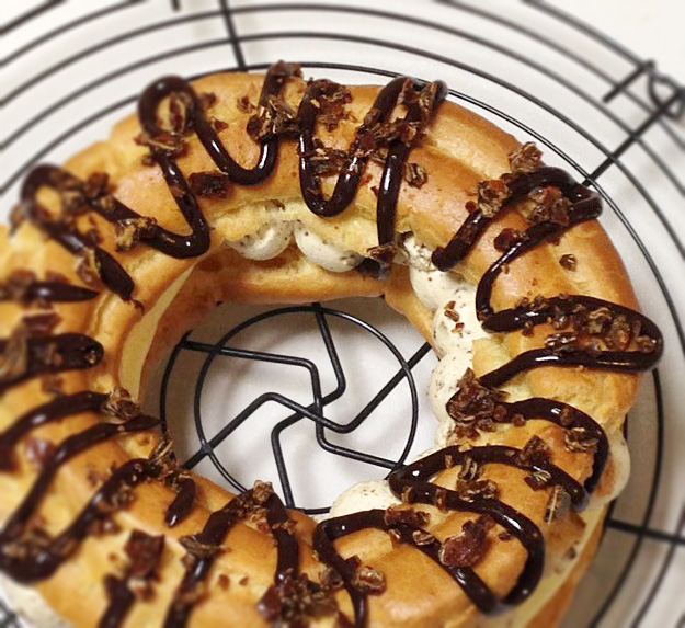 レシピは2層のクリームが食べやすい「エクレア」で、この形に意味があるということだったのですが、今回は贈り物のホールケーキだったので大きなリングシューの形にしてガナッシュで線描きし、上面にもプラリネを振りました。